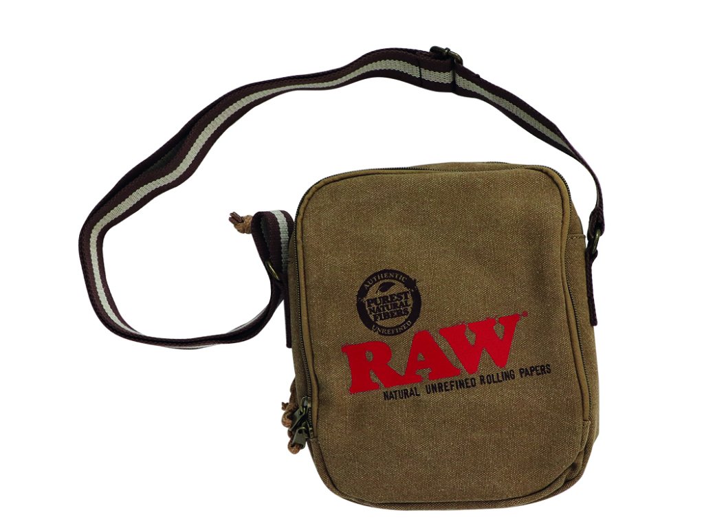 Ez a RAW márkájú barna színű táska kiváló minőségű anyagból készült. Minőségi cipzárral és három különálló zsebbel rendelkezik, amelyek képesek elnyelni a marihuána enyhe illatát. A táska mérete 21 x 18 cm, pántja pedig állítható, ennek hossza 65 cm. A táska elülső részén piros színű RAW logó látható.