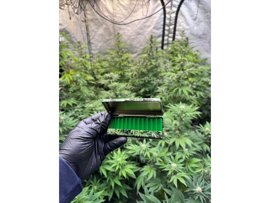 Fém rejtektároló kenderleveles motívummal, a cigaretta papírok és filterek tárolására.