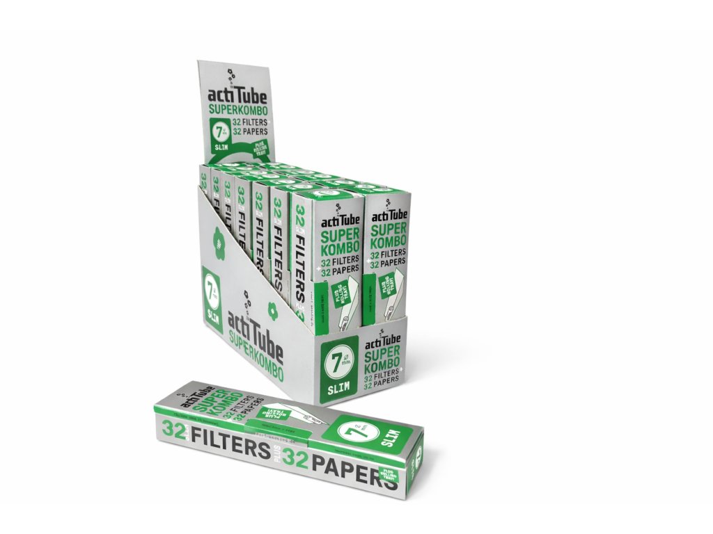 Az ActiTube Slim Superkombo egy praktikus „minden egyben” készlet, amely 32 darab extra vékony papírt és 32 aktív szénszűrőt (7 mm) tartalmaz. Az aktív szénnek hála a növényi anyag teljes aromája élvezhetővé válik, miközben a dohányfüst kátránytartalma jelentősen csökken.
