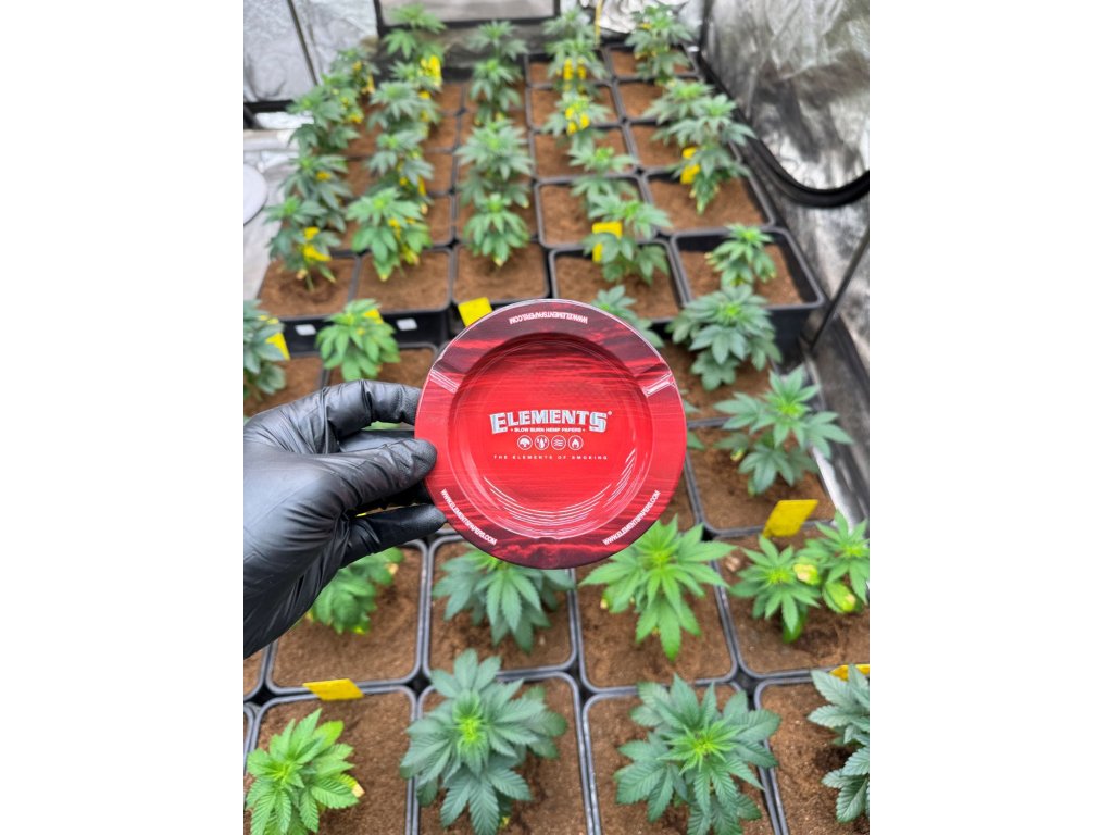 14 cm átmérőjű Elements acél hamutál. Könnyű és könnyedén hordozható. Hamutál az Elements cégtől, alacsony áron, ráadásul mágnessel ellátva, amely megtartja a hamutálat egy mágneses alátéten. Mélyvörös színű, az Element Red kiadás logója van rányomtatva, amely kiadás különlegességei a kender cigarettapapírok és az extra vékony filterek.
