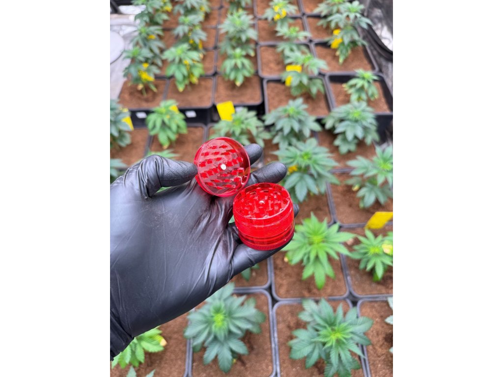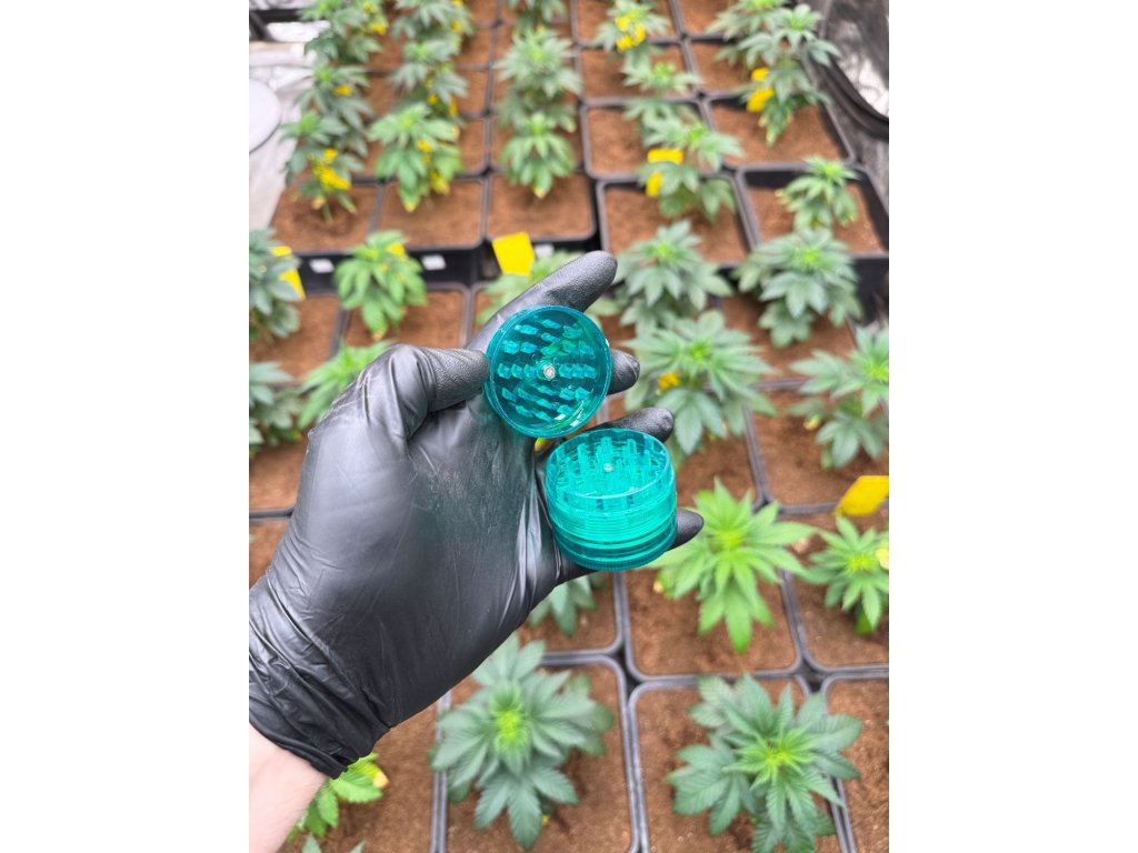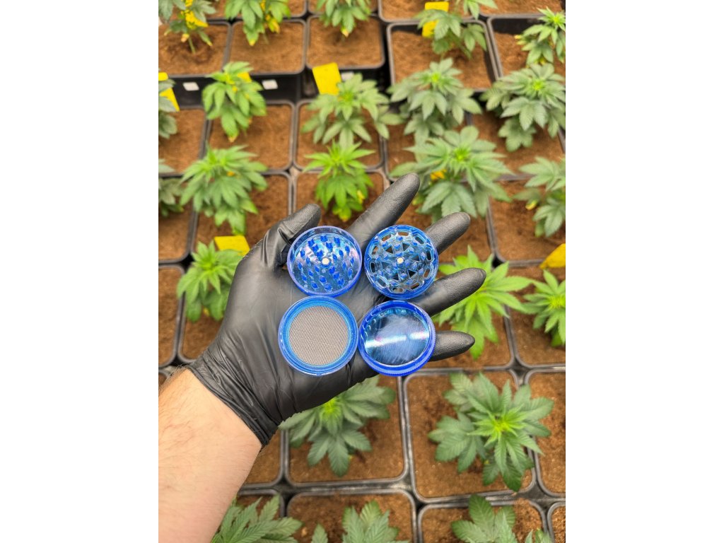 Négyrészes műanyag grinder szűrővel, nagyszerű áron és különböző színekben, amely a szárított növényi keverékek, például dohány vagy CBD kender kényelmes felaprítására szolgál.