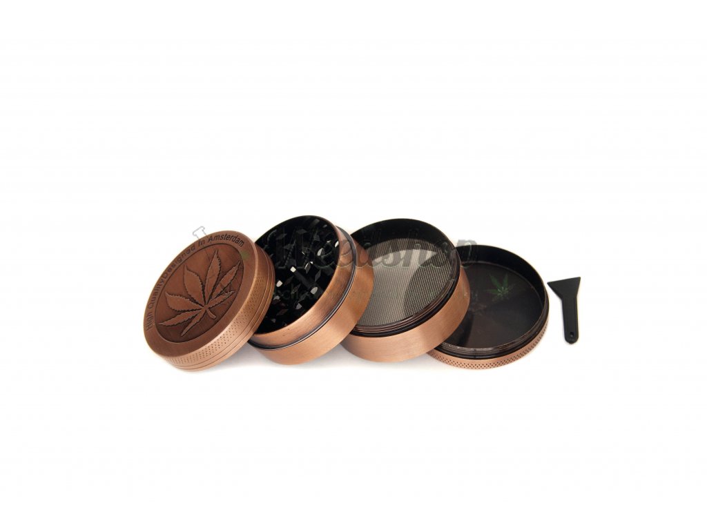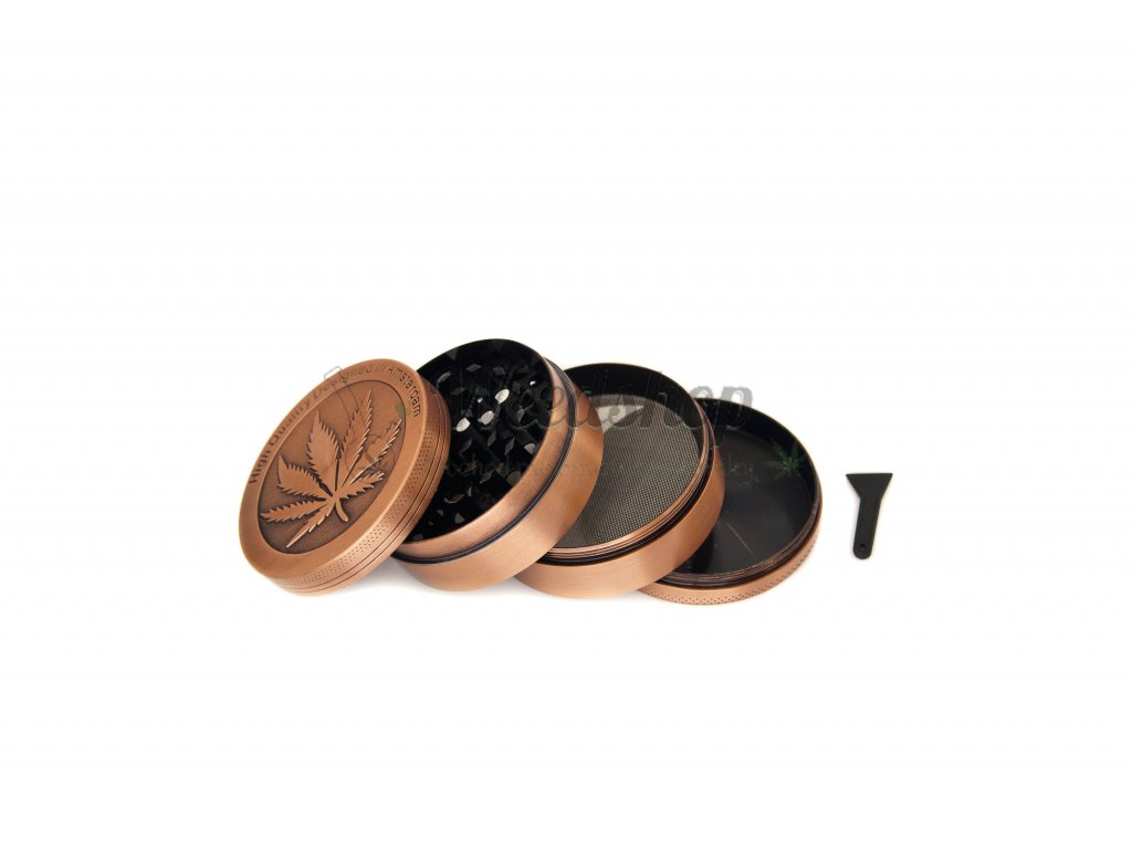 Kiváló minőségű fém morzsoló réz kivitelben, 4, 5 vagy 6 cm-es átmérővel, skaff/kief szűrővel és egy negyedik résszel a már összemorzsolt növényi anyagok tárolására. Rögtön háromféle méretben kapható. Kiváló minőségű anyagból készült, nem nyikorog, és nagyon éles fogakkal rendelkezik, amelyek megkönnyítik a szárított növényi anyagok vagy a legális marihuána morzsolását. A csomagtartalom része a népszerű szűrő és hozzá a lehúzó is a skaff/kief-re, amelyek megkönnyítik az orvosi kender gyantájának összegyűjtését.