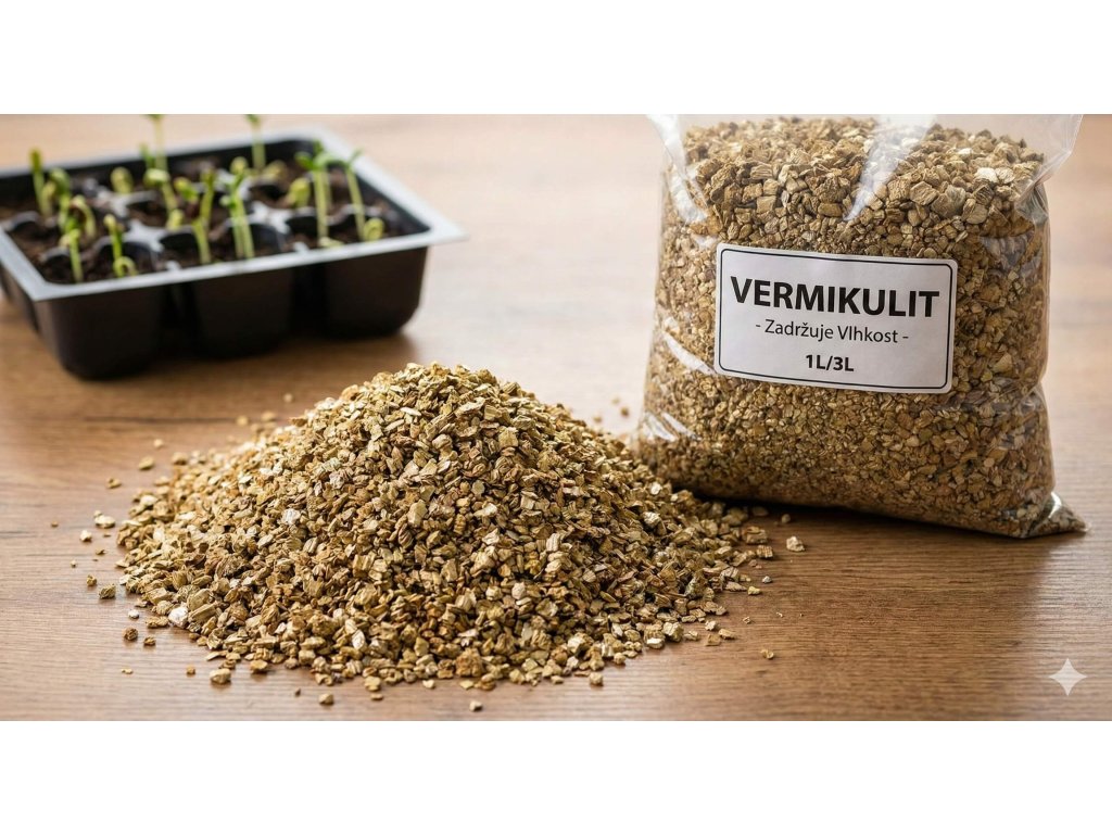 Vermikulit (aranyszínű pelyhek): Fő feladata a víz visszatartása és a közeg nedves állapotban tartása.