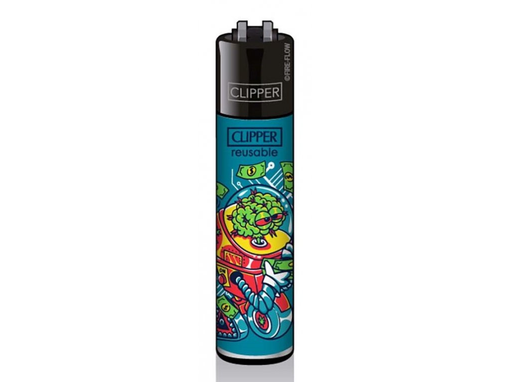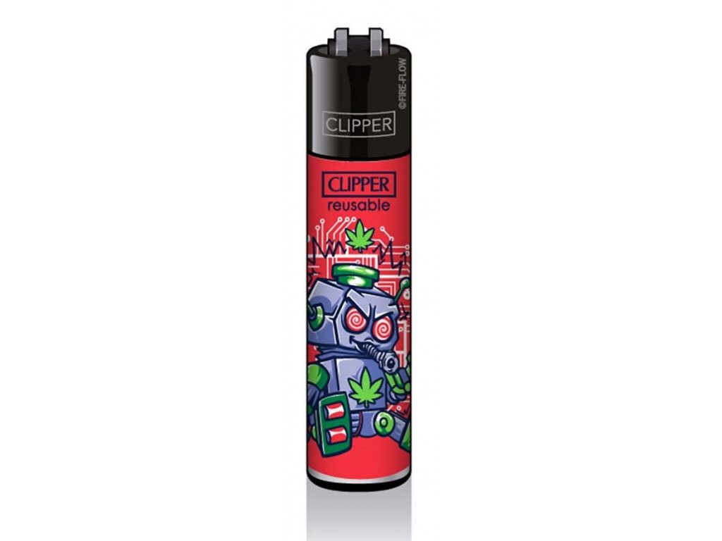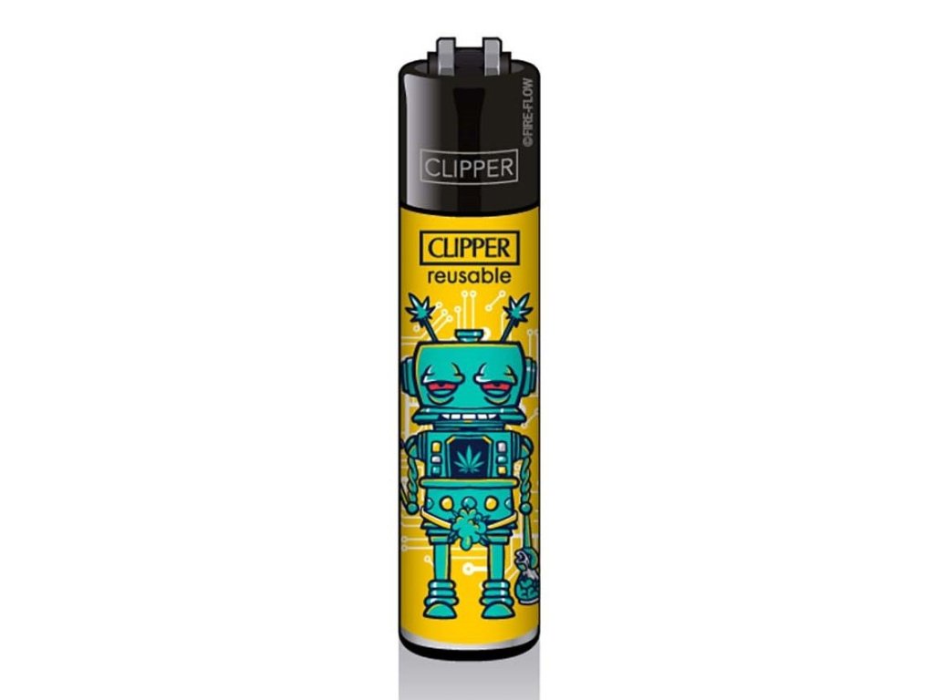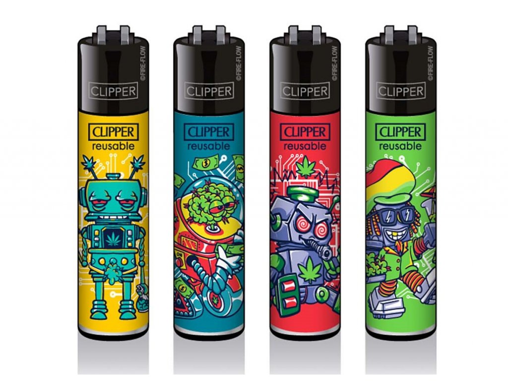 Clipper öngyújtók a 420 Robot nevű gyűjtő kiadásból. Az öngyújtók színes nyomtatással és robot-, illetve kendermotívumokkal vannak ellátva.