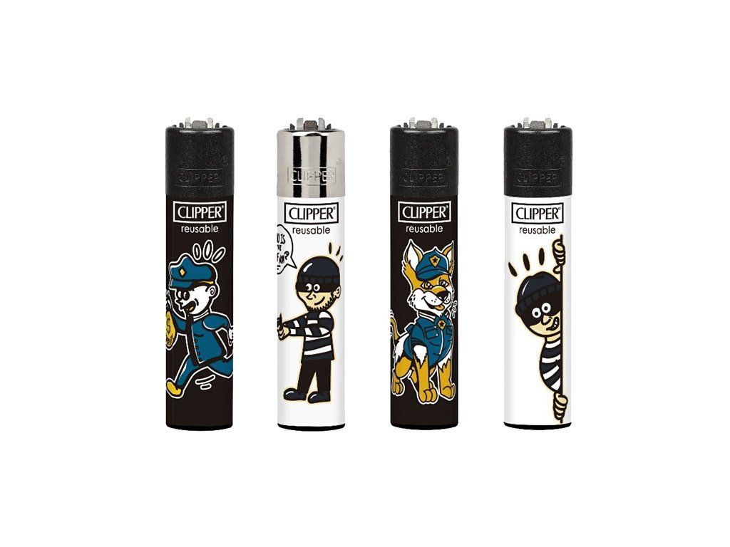 Olyan öngyújtót keres, amelyben van egy kis szikra és humorérzék? A Clipper Cops and Robbers limitált kiadás négy eredeti dizájnt kínál, amelyeket a törvény és az alvilág örök párharca ihletett.