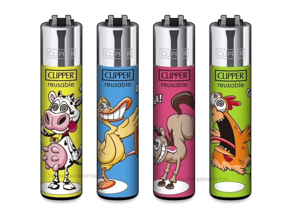 Clipper öngyújtók a Crazy Farm nevű gyűjtői kollekcióból. Az öngyújtók színes nyomtatásban, négy variációban készülnek, és farmon élő “őrült" állatok motívumával díszítettek.