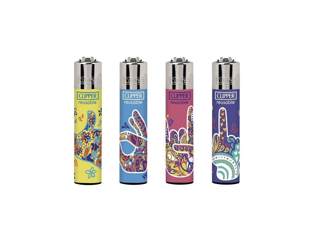 Clipper öngyújtók a Hippie Hands gyűjteményből. Az öngyújtók színes nyomtatásúak és hippi kezeket ábrázolnak. Az ár a Hippie Hands kiadásból származó teljes öngyújtókészletre vonatkozik.