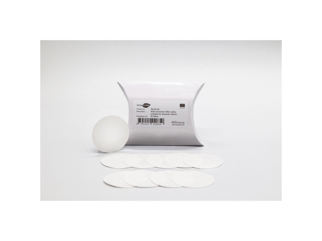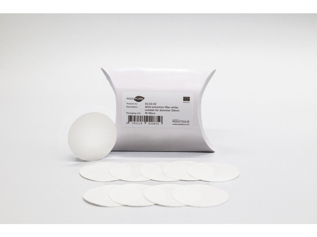A csomag 10 darab szabadalmaztatott ADQ extrakciós szűrőt tartalmaz, amelyek az AddiPure 50 mm átmérőjű extraktoraihoz készültek (például a PEO-120/50 modellhez).