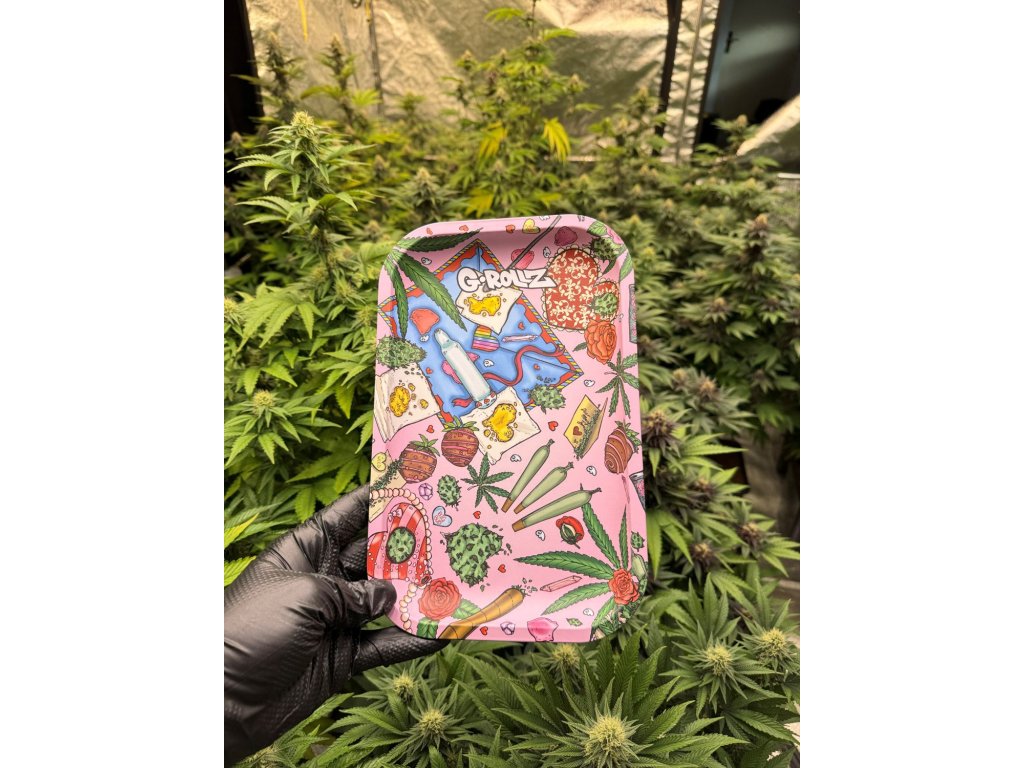 Minőségi sodrótálca, avagy alátét közepes méretben a G-Rollz márkától. A fém alátét 17,5 x 27,5 cm méretű, és különböző dohányzási kellékekkel, marihuánavirágokkal és szerelmi motívumokkal, például szívekkel, rózsákkal vagy eperrel van nyomtatva.