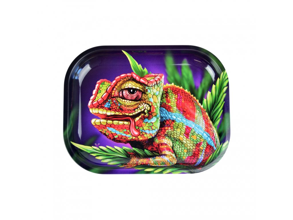 Fém alátét a V-Syndicate márkától kender csomagolásához, egy kaméleon motívumával, élénk színekben.