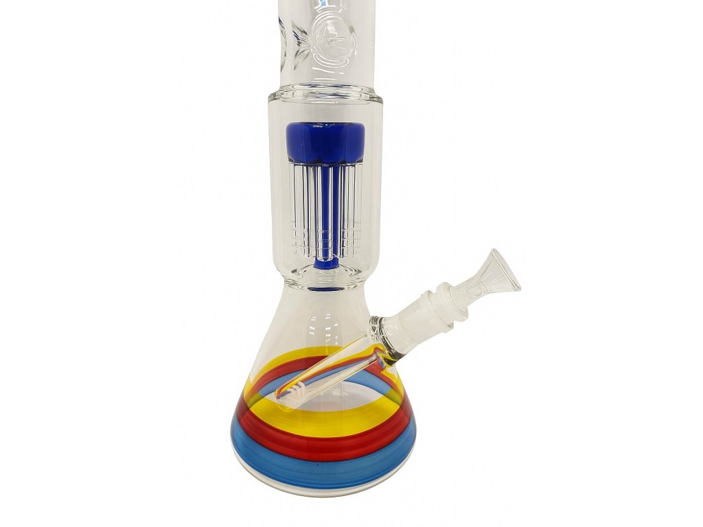Ez a 30 cm magas, üvegből gyártott bong a népszerű „Beaker” dizájnban készül, és kiváló funkciókkal teli, így tökéletes választás mindennapos használatra. Kúpos formájának köszönhetően rendkívül stabil, és ideális mennyiségű vizet képes befogadni. A lényege azonban belül rejlik: a bong egy hatékony, 8-arm perkolátorral van felszerelve, az erre szolgáló bevágásoknak köszönhetően pedig jéggel tölthető, tehát garantált a selymesen sima és hűsítő füstélmény – ezt jelenti az úgynevezett ice-bong. A stílusos színes elemek a szájrészen, az alapzaton és magán a perkoláción csak tovább fokozzák az alapból káprázatos látványt. A bong 18,8 mm átmérőjű adapterrel rendelkezik, amely 14,5 mm-re szűkül a végén és diffúzorral ellátott, emellett egy 14,5 mm-es átmérővel rendelkező üvegkazán is tartozik hozzá, amelyet praktikus üvegfogantyú egészít ki a felhevült kazán biztonságos kezelése érdekében.